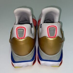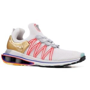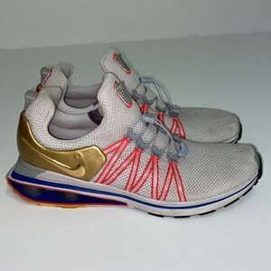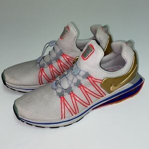 Nike Shox Gravity Olympic Shoes/Sneakers (AQ8553-009). The color is Vast Grey/Metallic Gold, and the size is men's 13. Features: Supple mesh upper for breathability Flywire cables for locked in fit Metallic Gold Nike Swoosh logos Nike redesigned Shox Gravity technology for improved cushion and rebound Flex Grooves on outsole