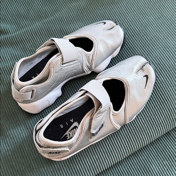 Sleek Nike shoes in metallic silver and white. Modern design with adjustable straps. These are super comfy, I bought them in Japan, but I want a different pair. These are a 7 but I wear a 7.5 and they are okay. PICS OF ACTUAL SHOES COMING.