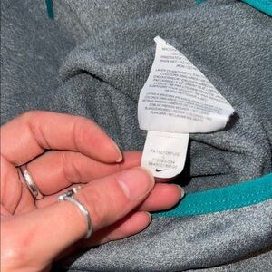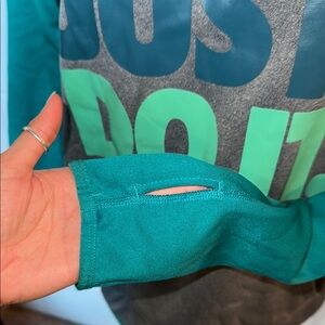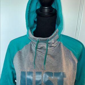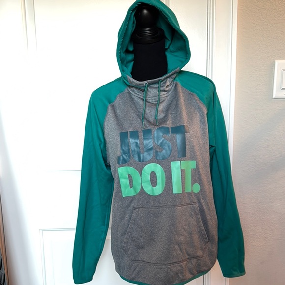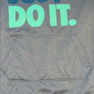 Nike Size Large Hoodie- Therma-Fit Grey with Teal Sleeves that do have the thumb hole design to keep your hands nice and warm while working out or running, The Hoodie drawstring, and Trimming around the bottom and the ‘JUST’ are all in the same coloring. & ‘DO IT.’ Is in more of a Green Color. But the Body is a Dark Gray and has a large pocket for storing whatever you may need on the go! If you tighten the drawstrings you can use the Cowl-neck to stay warm or you can loosen them up so it doesn’t sit so high on your neck. The hoodie is also double lined with an absorbent mesh lining if you decide to go that extra mile that day!😜