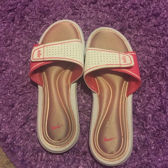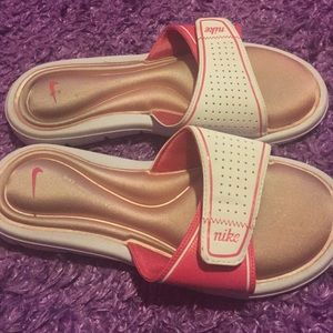 Pink and white Nike Slides. Good Condition. Dark spots from wearing black socks with these all the time. Price negotiable.