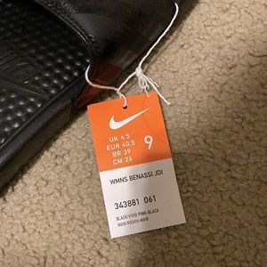 Black Nike slides with pink words on top