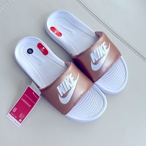 BRAND NEW!!! Nike slides with enhanced soft materials making it super comfy. Color is White with Metallic Gold.