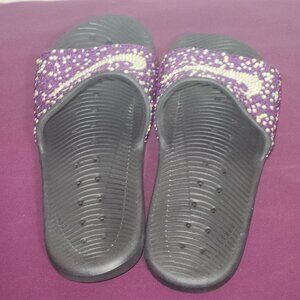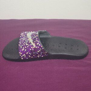 A pair of purple rhinestone type of embellishments on a pair of Nike slides. Size 7.5 to 8M