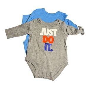 Adorable Nike baby set. Includes blue and gray bodysuits with smiley designs. Matching gray pants complete the look.