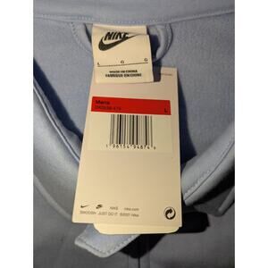 The Nike Solid Color Collar Zip Casual Long Sleeve Blouson Jacket in baby blue, size L, is a stylish and versatile outerwear option for men. Made from a blend of cotton and polyester, this jacket features a solid pattern, zip closure, and a collared neckline for a classic look. Perfect for casual occasions, the jacket is designed with a long length and a comfortable fit. The Nike brand adds a touch of athletic style to the jacket, making it a fashionable choice for everyday wear.
