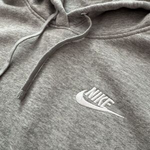 Womens Nike Club Fleece pullover hoodie in a soft heather gray with a clean white embroidered swoosh. Cozy midweight fleece, great for layering or everyday wear. Freshly washed and steamed, ready to ship.