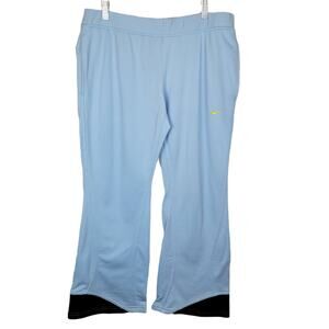 Nike Sphere Dry Mesh Baby Blue with Navy Kick Boot Pants. Side seam pockets. One back zip pocket. Yellow swish at left front. Elastic waist.