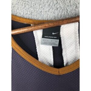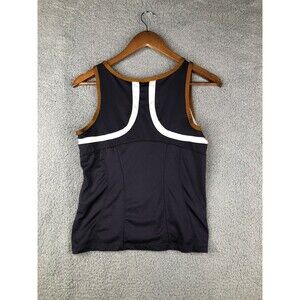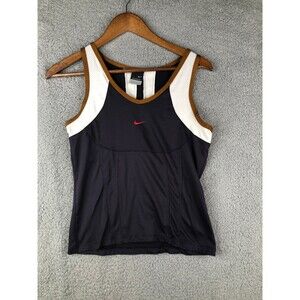 Preowned in good condition this is a very cute multicolored tank with brown copper trim the base is like a navy blue I guess and the swoosh is red length is 21 pit to pit 15 this is not padded