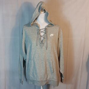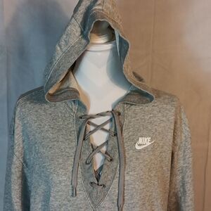 Stay comfortable and stylish with this gray Nike lace up hoodie. Size Medium with a pit to pit measuring 24" and a length of 28". Perfect for casual outings.