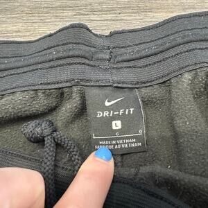 Nike Sportswear Dark Gray Mens L Drawstring Fleece Swoosh Athletic Sweat Pants In pre-owned condition. Adjustable drawstring, tapered leg pockets elastic waist fleece pockets, embroidered swoosh logo athletic training sporty.
