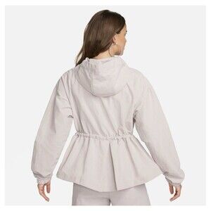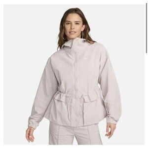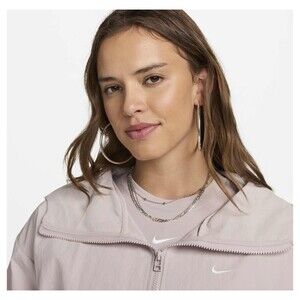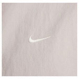 The Nike Sportswear Everything Wovens Women's Oversized Hooded Jacket in size L is a stylish and comfortable activewear piece perfect for warmer seasons. This windbreaker jacket features a solid Platinum Violet / Soft Pink color with long sleeves and a relaxed fit, making it ideal for outdoor activities or casual wear. Made with 100% nylon woven fabric, it offers a breathable and lightweight option for layering. The oversized design and Nike logo detail add a trendy touch to this athleisure jacket, suitable for summer, fall, and spring.