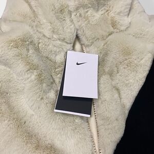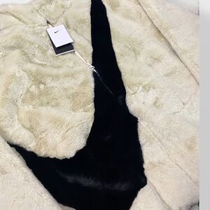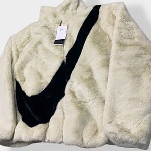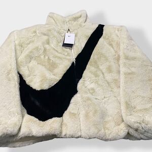 Nike Sportswear Faux Fur Fossil White Womens Big Swoosh Jacket DM1759-238 size L New with Tags
