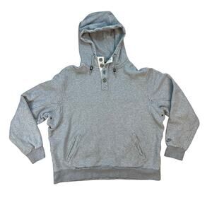 Cozy and classic Nike Sportswear pullover hoodie in a soft heather gray cotton blend. Features a 1/4 button front with drawstring hood, ribbed cuffs and hem, and kangaroo pockets. Tag size XXL — roomy, relaxed fit. Excellent pre-owned condition with no visible flaws.