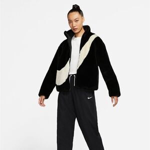 Go beyond bold. An oversized Swoosh logo meets luxe faux fur in a wear-anywhere jacket. Pair it with sweats to keep it casual, or dial it up with other rich fabrics to bring the heat to cooler months.