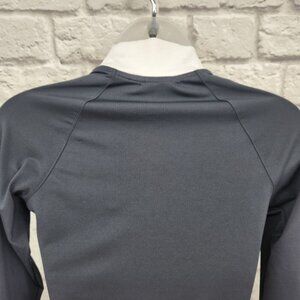 This sporty cropped top has vintage elements such as elongated cuffs and hem and a high rise collar.