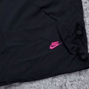 Women's Nike Sportswear Tech Pack Wide Leg High Rise Repel pants in black and pink. Style number fb8358-011. Pants have Water-repellent fabric and toggles at the hem. New with tags. Women's size XS, real measurements shown in photos with pants laid flat: