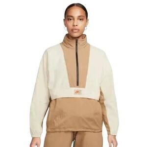 Nike Sportswear 2-piece tracksuit set featuring a half-zip pullover windbreaker jacket with hood and matching cargo jogger pants. Colorblocked in tan, cream, and khaki with neon orange interior waistband and Nike logo details. Pants include elastic drawstring waist, cargo pockets with zip, and ankle cuffs. Jacket features front zip, kangaroo pocket, and large back Nike swoosh circle logo print. Both pieces tagged size Small, made in Vietnam.