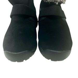 Particulars: Great quick pull on winter boots! These boots feature: suede panels front and side, elastic crossing front and back of ankle, reinforced toe, traction tread, and silky soft faux fur lining. Wear with the collar pulled up or rolled over.