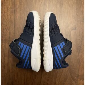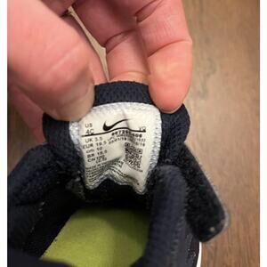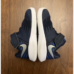 Navy blue Nike tennis shoes. Size 4 infant/toddler. Velcro strap closure, still in good condition. Wear is on the bottom, scuffs on the bottom of the white soles (see pic). Good for first walkers.