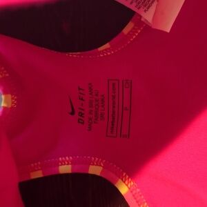 Vibrant pink and yellow striped sports bra by Nike. Perfect for workouts.