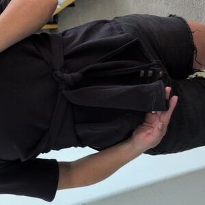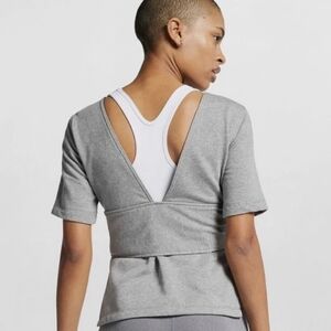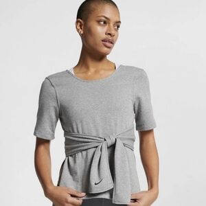 Nike Studio Front Tie Stretch Jersey Yoga Top Black Size Medium V-Back. Super cool unique top that feels like a thin sweatshirt material imo. Has a side pocket. Pre-owned excellent condition no flaws.