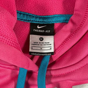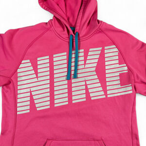 Nike Sweater Womens MEDIUM Pink Blue Hoodie Themra Fit Spell Out Silver Athletic