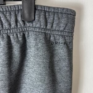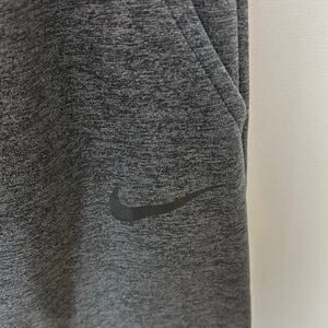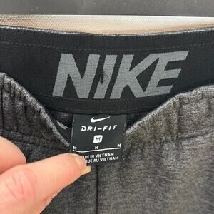 Gently Used Nike Dri-Fit Sweatpants. These are a men's medium. Heathered dark gray throughout. Black Nike swoosh on one leg. Straight leg fit. 100% polyester. Originally from 2018, but still in excellent shape!