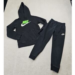 The product is a boy's small black Nike pullover sweatshirt with a hood and sweatpants. It is designed for boys and features a hooded style, making it both comfortable and stylish. The black color adds a versatile touch to the outfit, allowing it to easily be paired with different bottoms for a variety of casual looks. Perfect for everyday wear or as a casual outfit for special occasions.