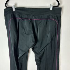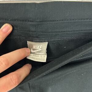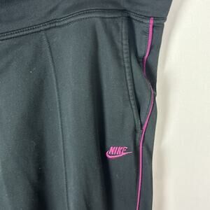 Gently Used Nike Sweatpants. These are a women's XL (16-18). Black throughout with a maroon accent down the side of the legs and the rear. Wide leg fit. Maroon Nike text and swoosh logo. Two front pockets. 100% polyester. Made in Malaysia. Bit of a retro / vintage item, from 2008. Still cute and in great shape!