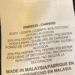 Nike sweatshirt is a full-zip drawstring hoodie with front pockets. The outside feels like traditional sweatshirt material and the inside feels like soft terrycloth. Both the inside and outside are very, very soft and cozy. The fabric is stretchy like you'd expect from a sweatshirt, and the material tag is shown in one of the photos.