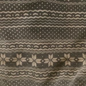 This cool sweat jacket is light black and grey, and the pattern looks like it could be interpreted as snowflakes or poinsettias IMO, but may not be either. In any case, the patterns are geometric (see photo for close-up).