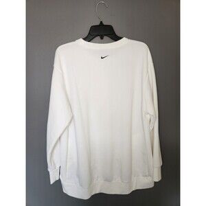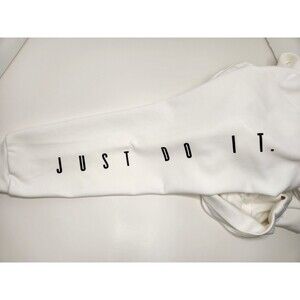 This Nike Sweatshirt for men in size L features a solid white color with the iconic "Just Do It" arm spell out design. Made from a blend of polyester and cotton, this pullover sweatshirt offers comfort and style. It includes a crew neckline, long sleeves, and convenient pockets, making it a practical choice for everyday wear or athletic activities. With the Nike Dri-Fit technology, this sweatshirt is machine washable and designed to keep you dry and comfortable during your workouts. This sweatshirt is a must-have addition to any man's wardrobe.