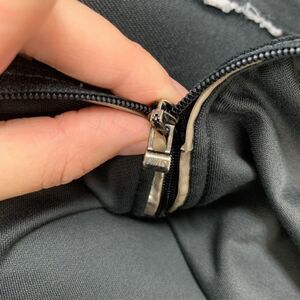 Snapped zipper pull (still works), size and material tag missing, minor thread pulls front, embroidered details, minor wear on collar