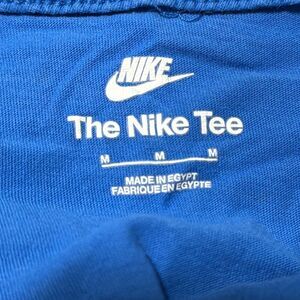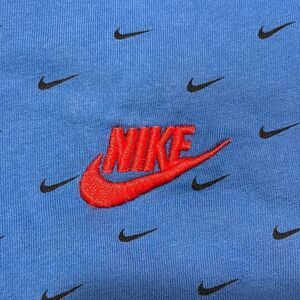 New without tags short sleeve Nike tee featuring an all over swoosh logo print against a vibrant blue and an embroidered swoosh detail in orange.