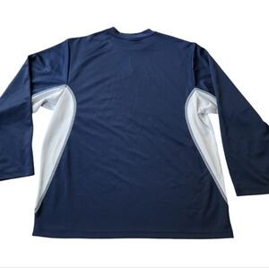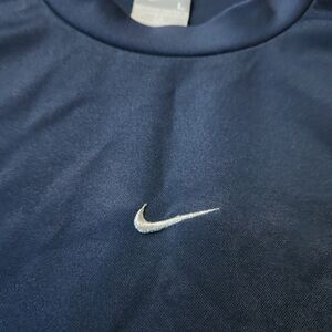 Nike Sz L Center Swoosh Long Sleeve Top. Navy Blue with light grey sides, silver embroidered swoosh. Good used condition, don't see any holes or stains. One small snag (pics). Flat measurements approximately