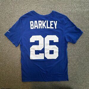 The product is a Nike men's XL T-shirt in blue, featuring Saquon Barkley's number 26 and the logo of the New York Giants. This officially licensed NFL fan apparel is made with Dri-Fit technology for comfort during football games or everyday wear. The shirt is a perfect choice for fans of both Saquon Barkley and the New York Giants, showcasing team pride and support for one of the league's standout players. This high-quality garment is designed by Nike and manufactured in Nicaragua.