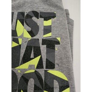 This Nike Boys T-Shirt, known as The Nike Tee, features a trendy athletic cut designed for active comfort. Crafted in a soft gray fabric, this pullover tee highlights a bold graphic print on the front with the iconic phrase "JUST THAT GOOD" in black and neon yellow accents, along with the classic Nike Swoosh logo beneath. The eye-catching geometric pattern within the lettering adds a dynamic, sporty vibe to this versatile top.