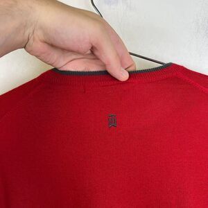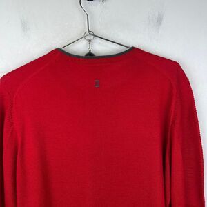 red knit, athletic sweater, preppy style, golfwear, crewneck, casual sports, winter pullover, men's apparel, performance knit, sporty casual