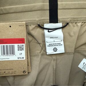 Nike athletic shorts in tan. Features a sleek design with black accents.
