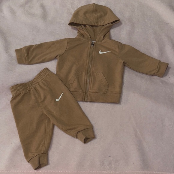 Charming tan baby hoodie and pants set. Features iconic Nike swoosh.