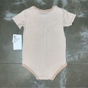 Nike two piece set. Top is one piece with tan and white horizontal striping, tan piping around neck and legs. Snaps at bottom, short sleeve. Nike swoosh left chest. Pants are tan with elastic waist. Jogger style with white swoosh left thigh. Infant boys 24 months brand new with tags.