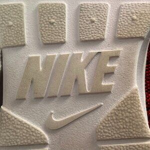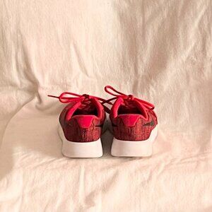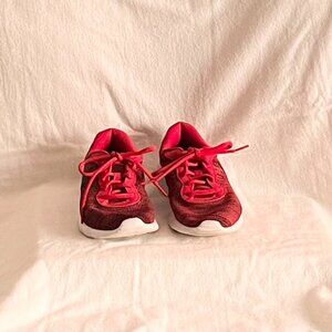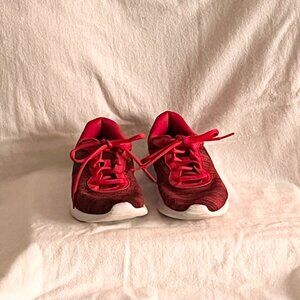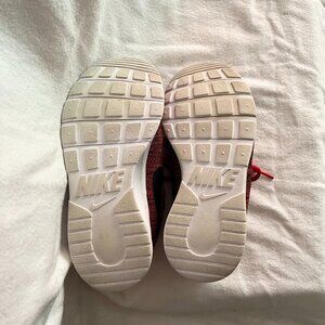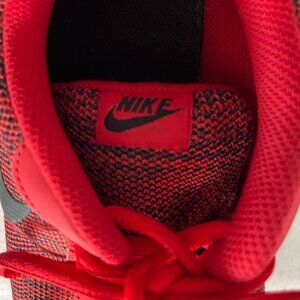 These are a pair of athletic shoes by Nike. The upper portion of the sneakers is a lightweight cloth in University red and black. The laces are red as well as the area around the laces. The opening is padded for extra comfort. The soles are a white rubber.