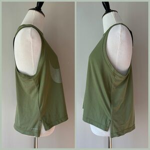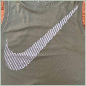 Size medium, olive / army green Nike tank top / muscle tee in good pre-loved condition. One teeny tiny hole at the neckline from the tag and one small mark above the tip of the Nike swoosh as shown in photos. Flattering high-low cut. •I’m open to fair offers and negotiations on all items!•