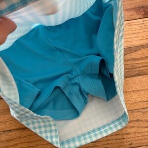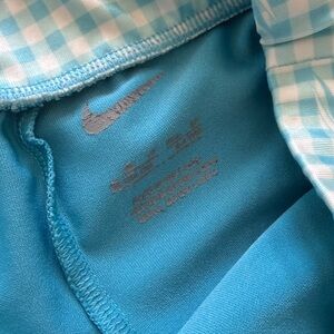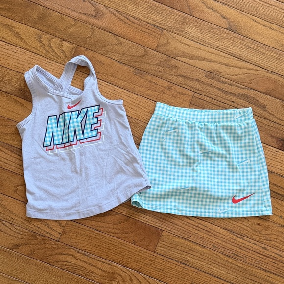 Purple tank top with bold Nike logo. Blue checkered skort featuring red swoosh.