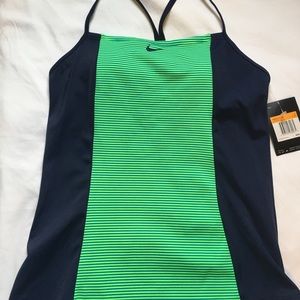 Nike Tankini Bathing Suit; Navy Blue with Lime Green Stripes; Nike symbol on top with removable padded cups and Nike symbol on the back of the bottoms