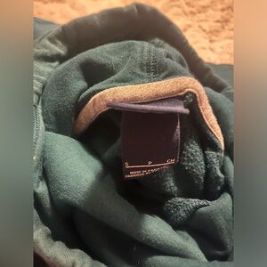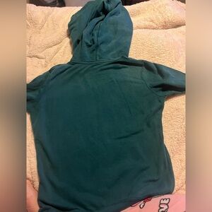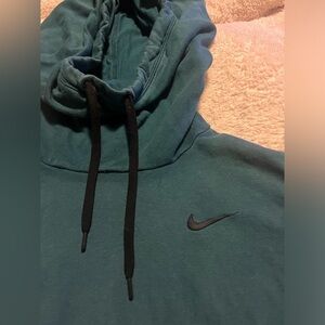 Comfortable teal hoodie with black drawstrings. Features a front pocket, cowl neck and Nike logo.