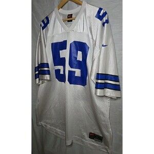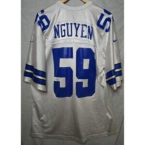 The product is a Nike Team NFL Jersey #59 Nguyen in size XXL, featuring the colors white and blue. This officially licensed jersey is designed for men and represents the Dallas Cowboys team in the National Football League (NFL). Made by Nike, a reputable sports brand, this jersey is perfect for showing support during football events in the regular season. With a capacity of 13 oz, this jersey is a must-have for fans of the sport and the Dallas Cowboys team.