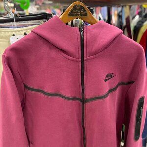 Cozy and stylish Nike Tech Fleece hoodie in a rich burgundy color. Features a full zip front, sleeve zip pocket, and the iconic Nike swoosh. Lightweight yet warm — perfect for everyday wear, workouts, or layering.