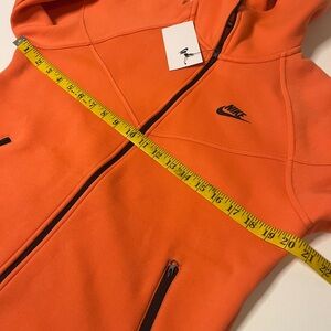 Nike women's tech fleece windrunner zip-up hoodie in a size medium. This hoodie has 2 pockets and a full zipper. The hoodie is a nice peach color or magic ember, and black. The inside lining is the same material as the outside. This hoodie is made out of 53% cotton, 47% polyester.