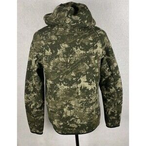 The Nike Tech Windrunner Fleece Mens Full-Zip Hoodie in SMALL Black Olive is a stylish and versatile activewear piece designed for athletic activities. Made from a blend of polyester and cotton fleece, this hoodie is lightweight and perfect for all seasons. Featuring a mock neck with a full zip closure, it is equipped with a hood, pockets, and a tagless design for comfort. The camouflage pattern adds a trendy touch to the Nike Windrunner collection, making it suitable for various outdoor sports and activities like basketball, running, hiking, and more. [CLOSET]